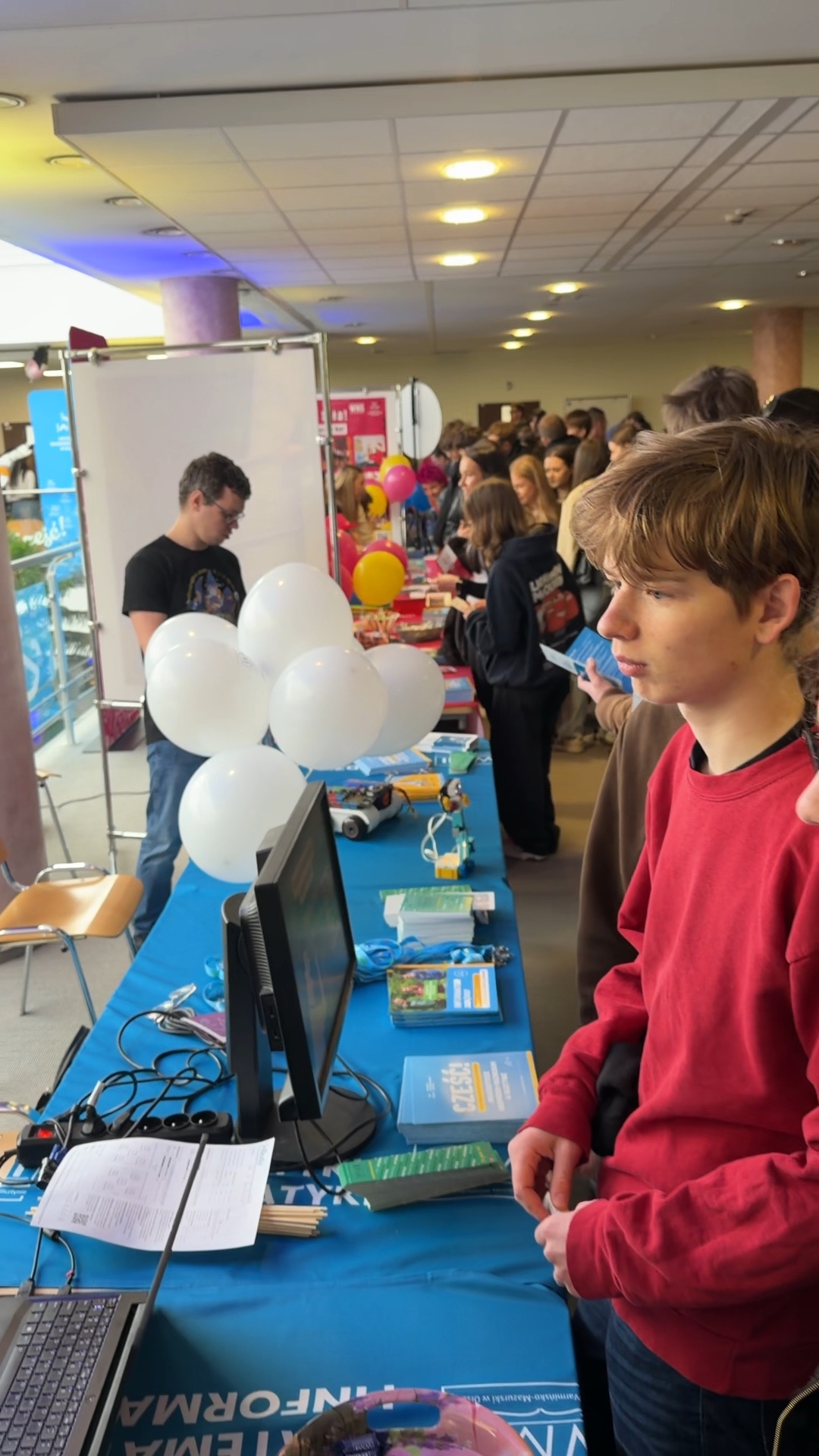 Przy stoisku Wydziału Matematyki i Informatyki zgromadziło się wiele osób, które chciały poznać ofertę studiów na naszym wydziale. Studenci z Rady Wydziałowej Samorządu Studenckiego WMiI z zaangażowaniem odpowiadali na każde zadane pytanie. Na naszym stanowisku zaprezentowaliśmy robota Lego Spike oraz udostępniliśmy mini gry komputerowe.
